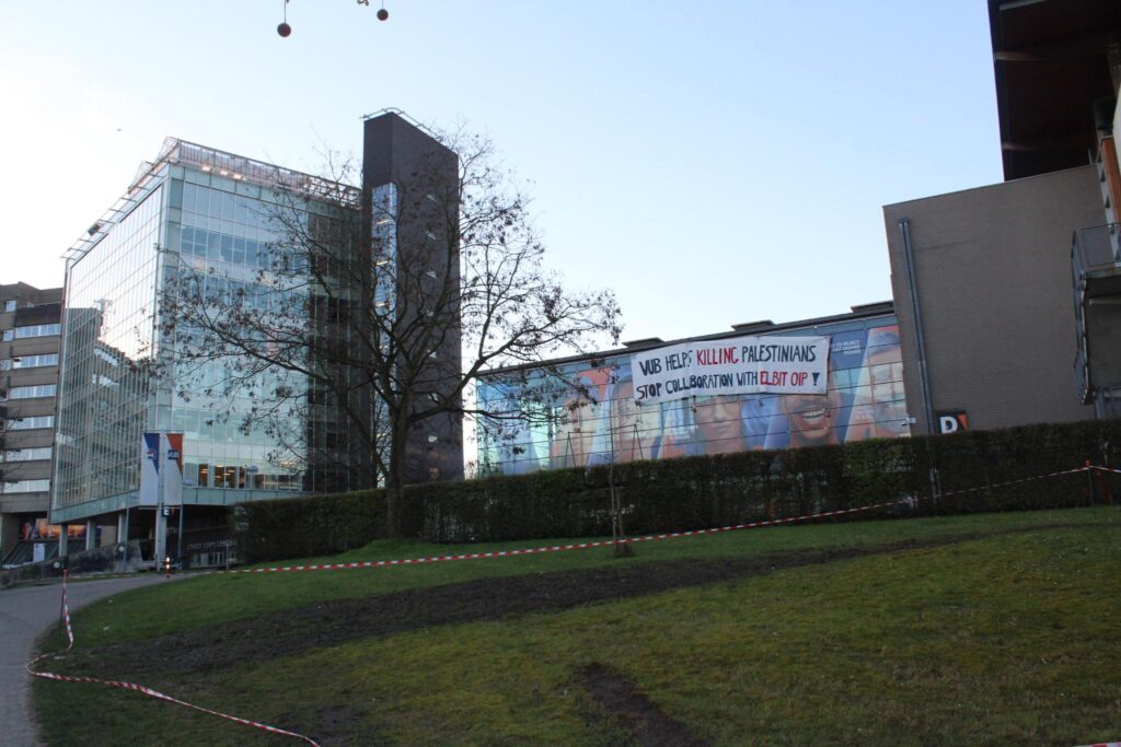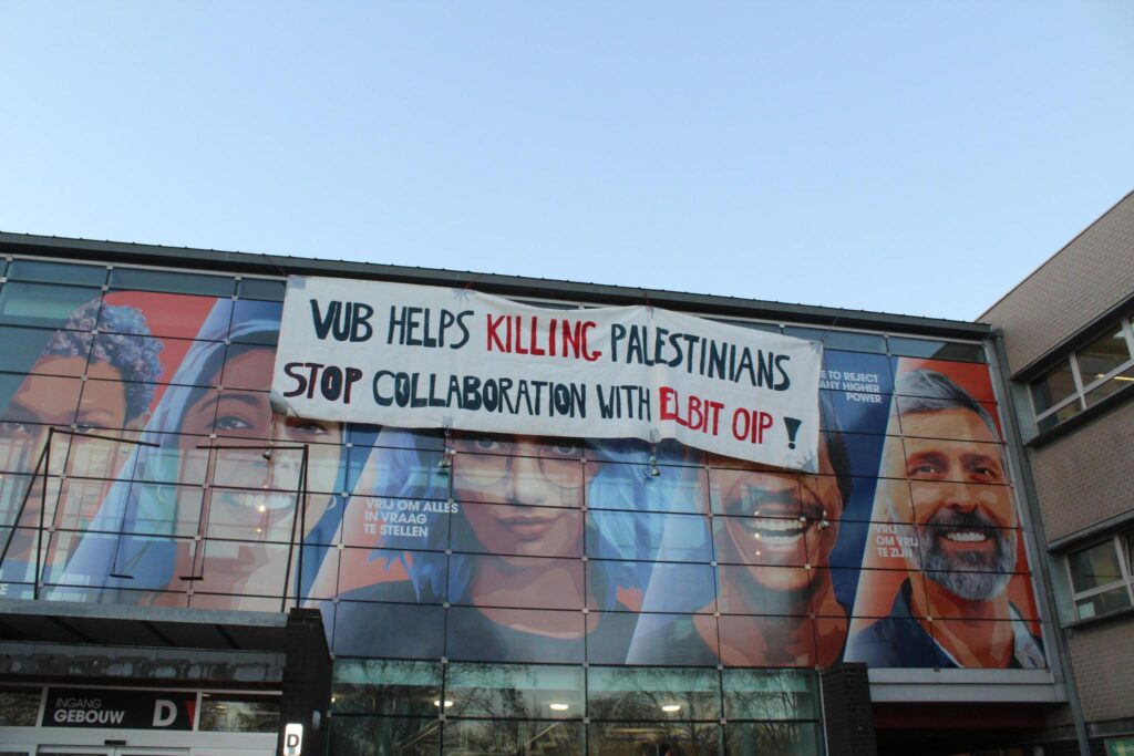 Mercredi matin tôt, des militant·es ont attiré l'attention sur la VUB pour dénoncer sa collaboration avec la filiale belge OIP de l'entreprise d'armement israélienne Elbit Systems. Sur le campus d'Etterbeek, une grande banderole visibilisant que « La VUB aide à tuer des Palestinien·nes » a été déroulée et des portraits de résistant·es palestinien·nes pour la liberté ont été affichés sur le campus.