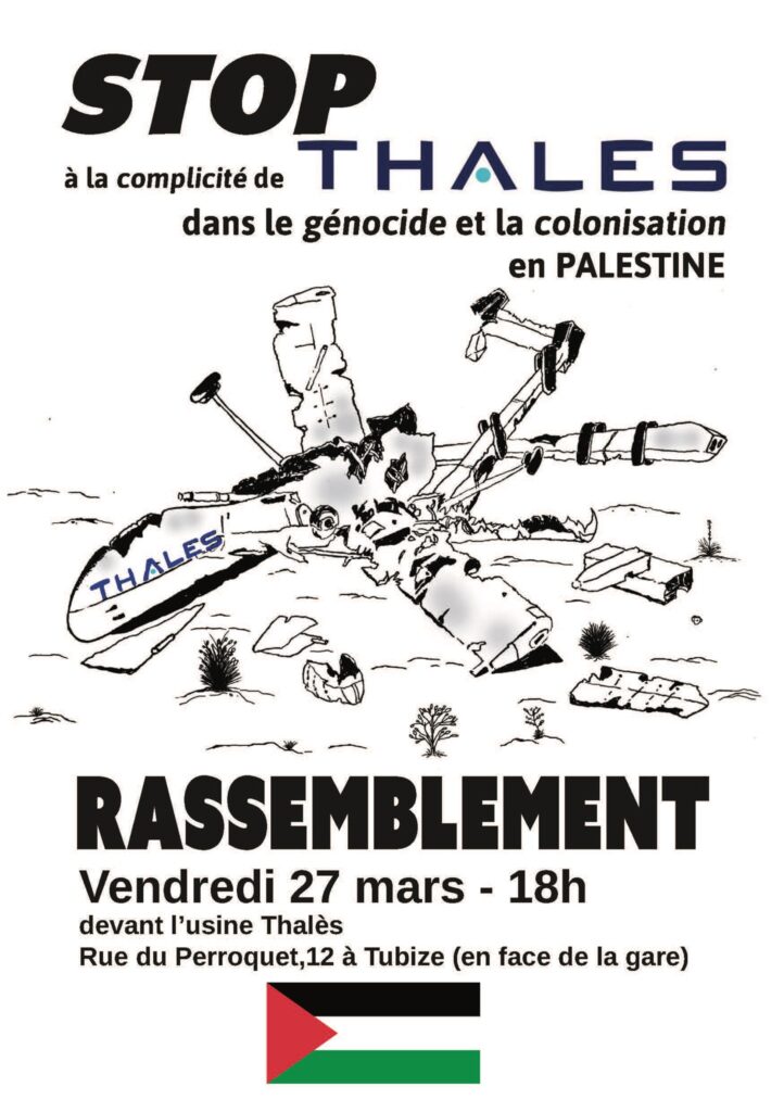 Het collectief 'Action Palestine Braine-Ecaussines' roept op voor een demonstratie in Tubeke (tegenover het treinstation) op vrijdag 27 maart van 18u tot 19u30. Ze organiseren dit in het kader van de campagne 'Stop Arming Israël Belgium'. Hun boodschap is gericht naar Thales, een bedrijf dat medeplichtig is aan de genocide in Palestina.